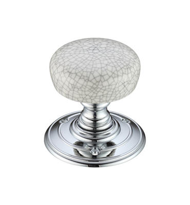 These door knobs are available in a grey crackle glaze porcelain knob with a polished chrome rose.