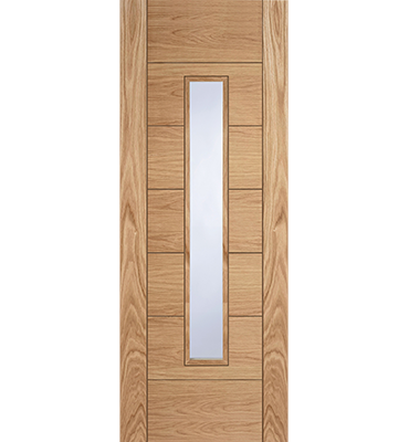 The Internal Oak Pre-Finished 18G Central Clear Glazed Corsica fire door is a stylish horizontal panelled door.