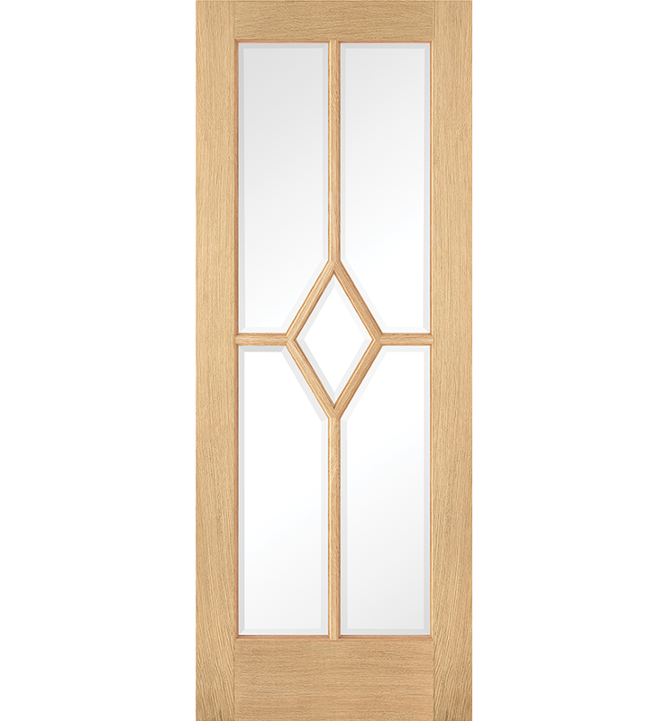 This door brings a new option to the Reims style of doors, now coming in a Pre-Finished oak style. This internal door features five clear glazed panels underneath a unique diamond design made from decorative beading. The door sets itself apart from the rest with its unique and distinct diamond design which is formed using decorative beading makes this door a recognisable piece. This door with its elegant design would certainly make a great addition to a multitude of more traditional styled interiors.