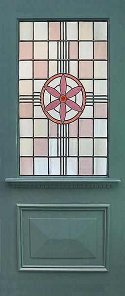 The glazing shown in the photo (flower design with geometric pattern) is available in both single and encapsulated glass options. If you wish for this feature pattern to be supplied with your door, please select it from the "Glazing" dropdown box above.