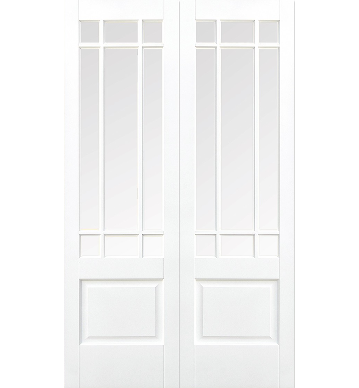 The White Primed Downham Glazed pair from LPD Doors is a sophisticated design formed by using decorative beading to create nine individual glazing panels above a single bottom panel within this traditional style door.